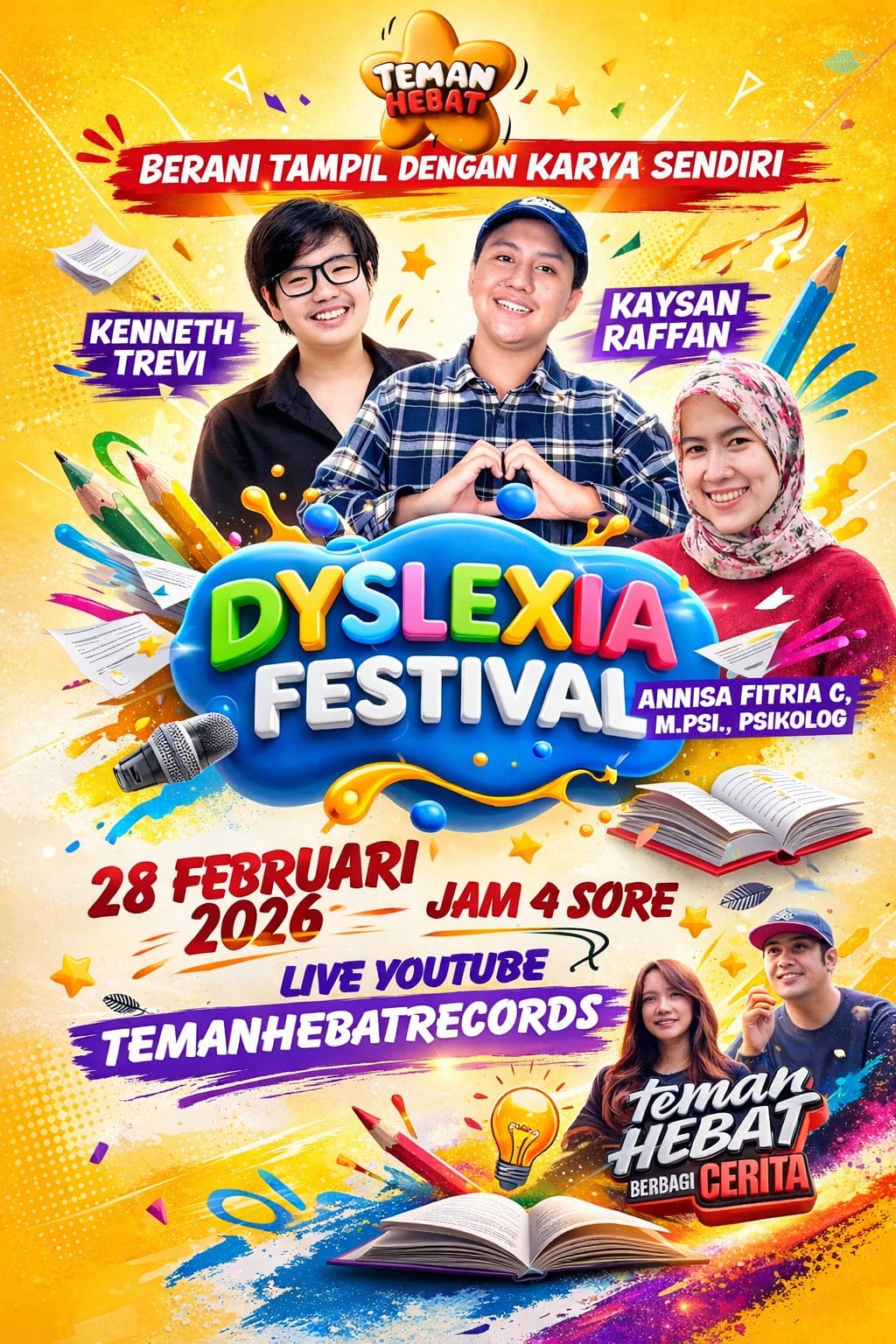 @dyslexiafestival #part1 BERANI TAMPIL DENGAN KARYA SENDIRI πLive Youtube @temanhebatrecords β° Sabtu, 28 Februari 2026 β’ 4Sore π Kenneth Trevi & Kaysan Raffan π Annisa Fitria C, M.Psi., Psikolog π€ Yuly & Rulli Aryanto ** mau datang langsung bisa whatsapp 0821.1133.2296