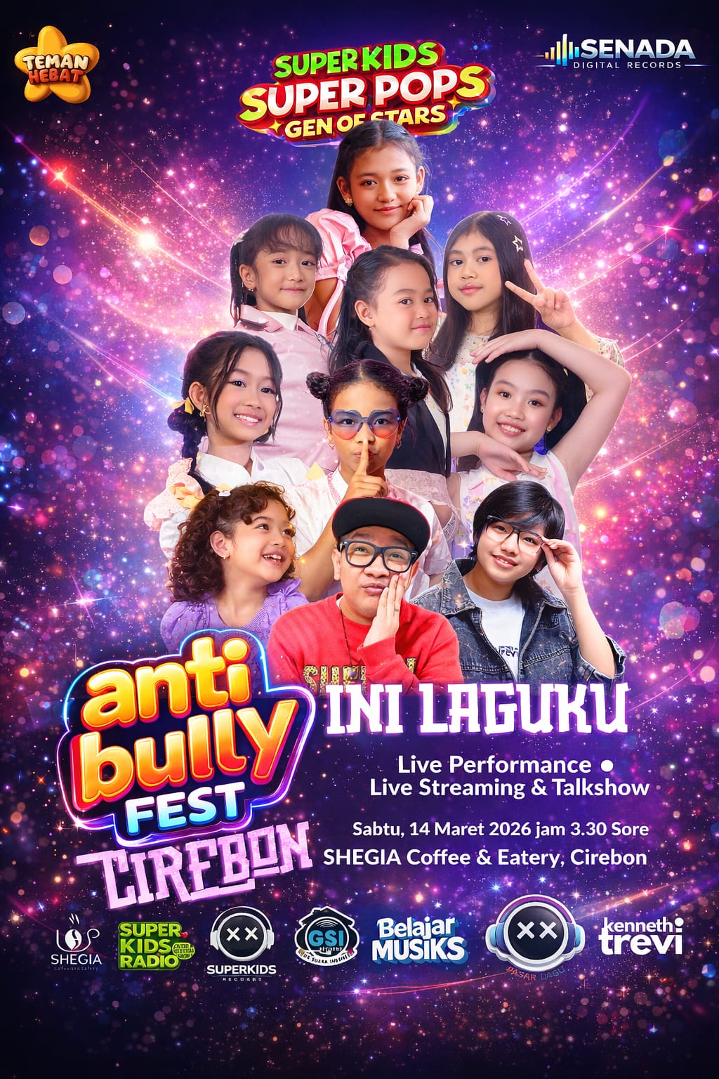 Kembali hadir ANTI BULLY FEST ke 3, kali ini di kota Cirebon. Kenneth Trevi kembali hadir sebagai artis, penyanyi yang memotori adanya ANTI BULLY FEST ini. β πΒ Sabtu,14 Maret 2026 ββ°Β Mulai jam 15.30 (3.30Sore) OnTime βπΒ Β Shegia Coffee & Eatery, Cirebon β βBersama, Bangga Nyanyi Lagu Sendiri βEvent ini π¨π‘π§π¨π π¦π¨π£ππ₯ππππ¦+π¦π¨π£ππ₯π£π’π£π¦ & π¦ππ‘πππ₯π¦ πππππππ₯π π¨π¦πππ¦ π±πΆππ²πΉππΏππ΅ ππ‘ππ’π‘ππ¦ππ yang telah memiliki Lagu dari kami dan mau promosikan lagunya ππ§ join PROMO 0815.3275.0907